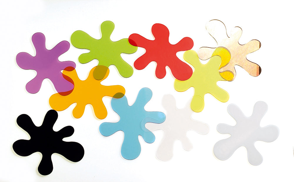 The set includes splats in the primary and secondary colours (red, blue, yellow, green, orange and purple) as well as clear, black, white and a double-sided mirror (black, white and mirrored are opaque).