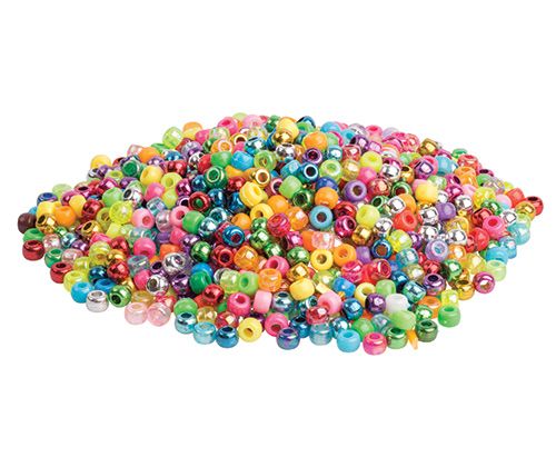 A mix of bright opaque and translucent coloured round pony beads that are great for threading for beginners with a large open hole.