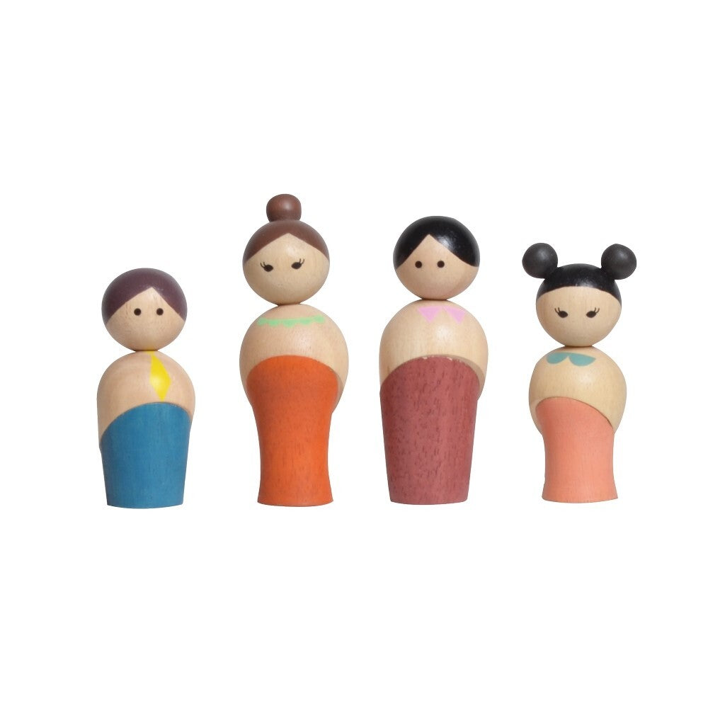 The doll houses abstract and vivid design is meant to inspire open-ended play. Furniture and doll family of four are included.