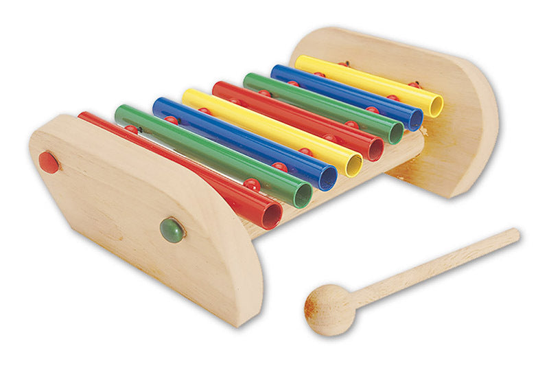 Play by striking the differently sized metal tubes with the wooden mallet. Encourages tonal and rhythmic exploration.