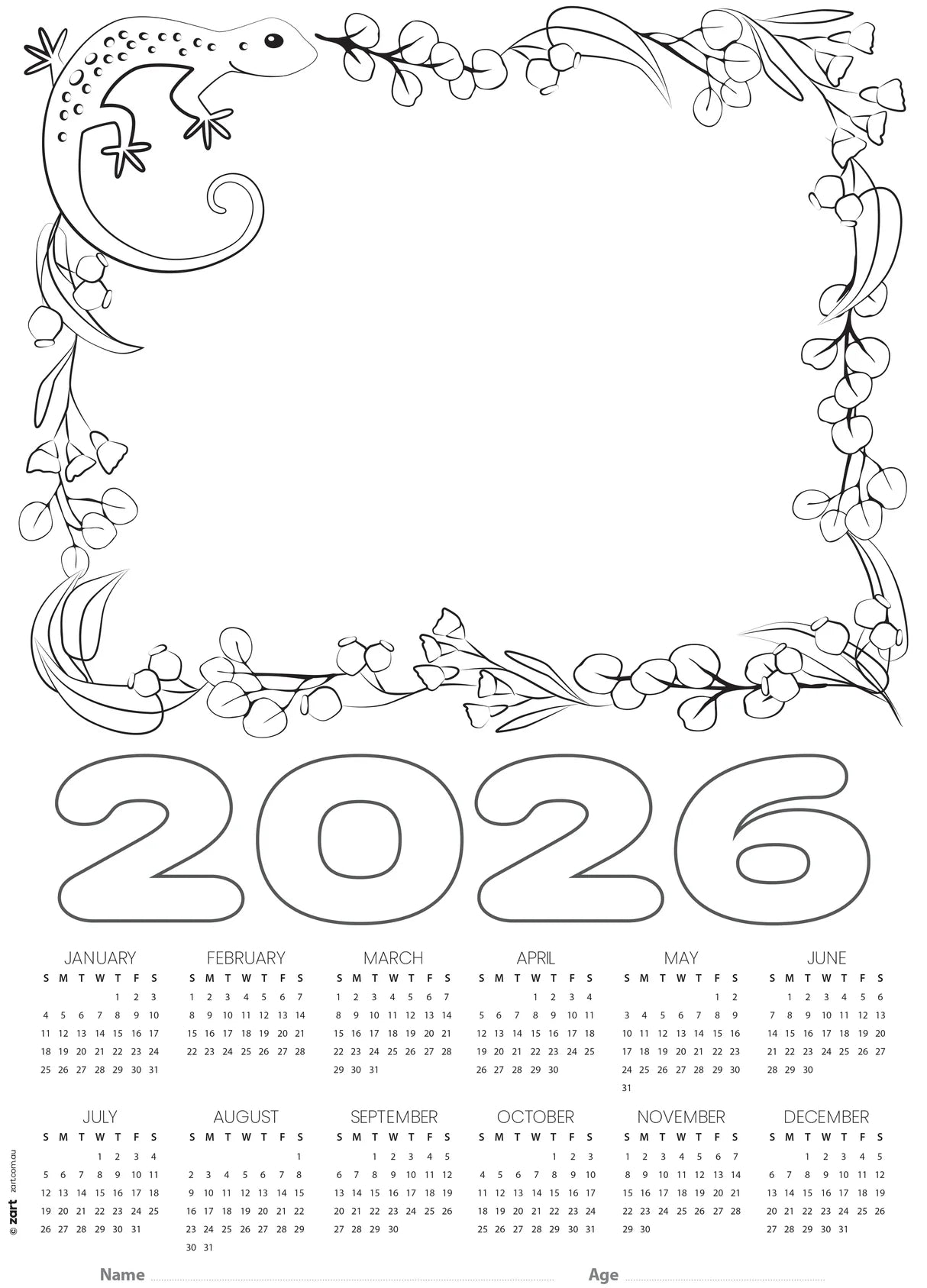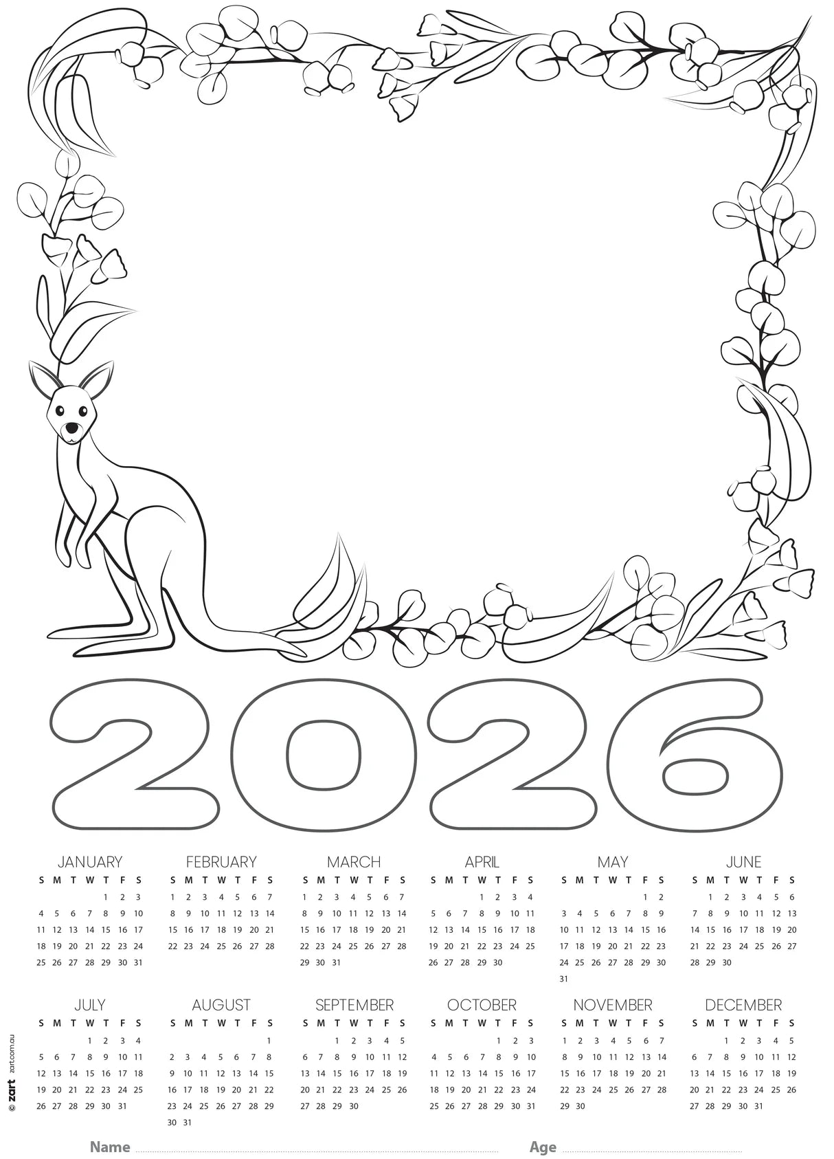 Each pack includes 25 calendar blanks, printed on sturdy 250gsm cardboard with a smooth surface that supports pencil, crayon, marker, paint, and collage materials. The lower half of each page features a printed monthly calendar, while the upper half provides a dedicated space for students to draw, paste a photo, or create a themed artwork. Surrounding this space is a beautifully pre-printed outline border design featuring native gum leaves and one of five Australian animals—Koala, Kangaroo, Echidna, Emu, or Frill-Neck Lizard—ready for students to colour in.