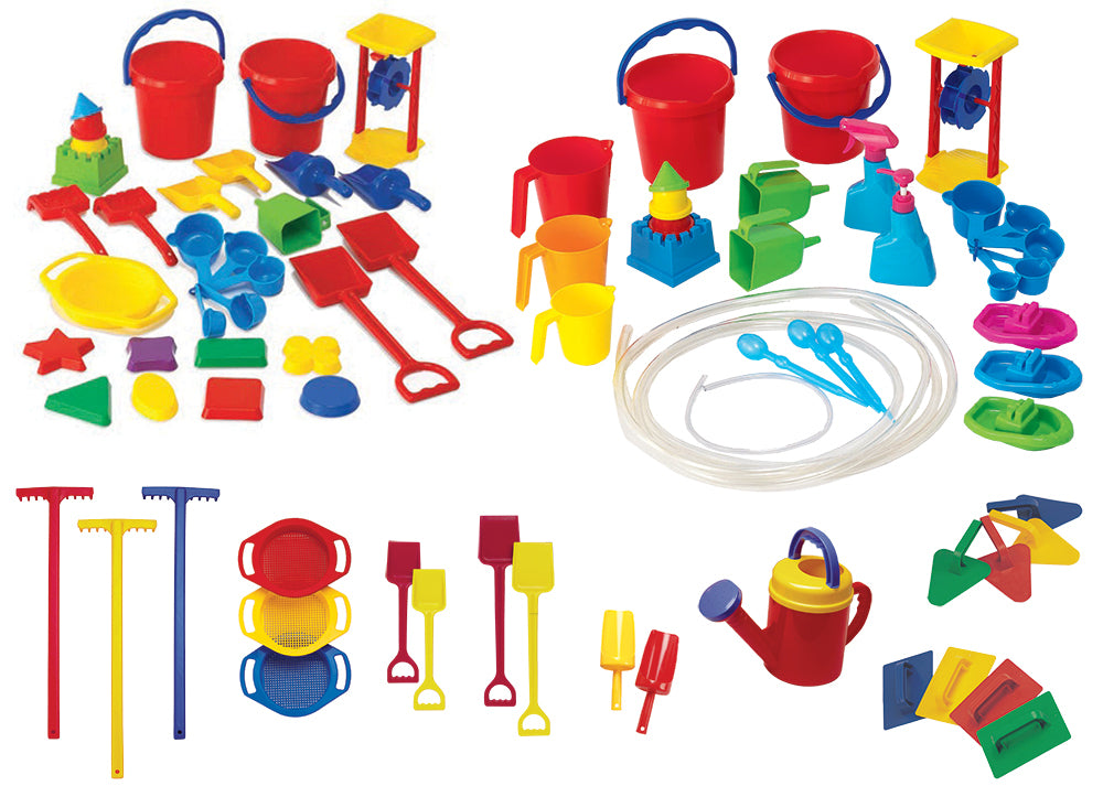 This sand and water tool set contains everything needed for creating a fun sand and water play environment, including shovels, scoops, rakes, hand rakes, sieves, buckets, watering cans, water wheels and sand moulds.