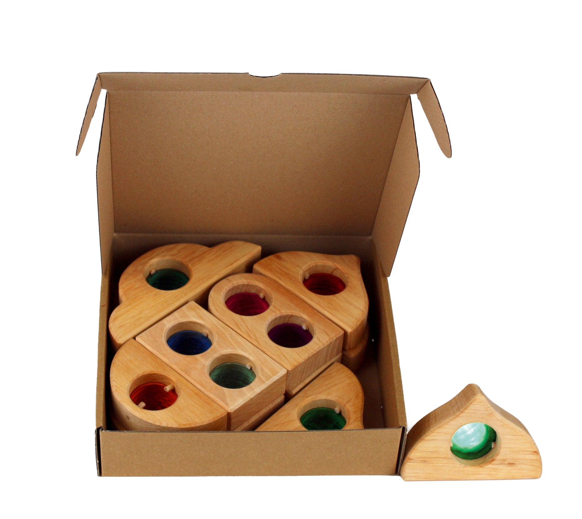 Playing with light and colour, these Bauspiel wooden Fairy Tale windows 12 parts are a natural wood block featuring a translucent coloured window pane in each beautifully shaped piece.