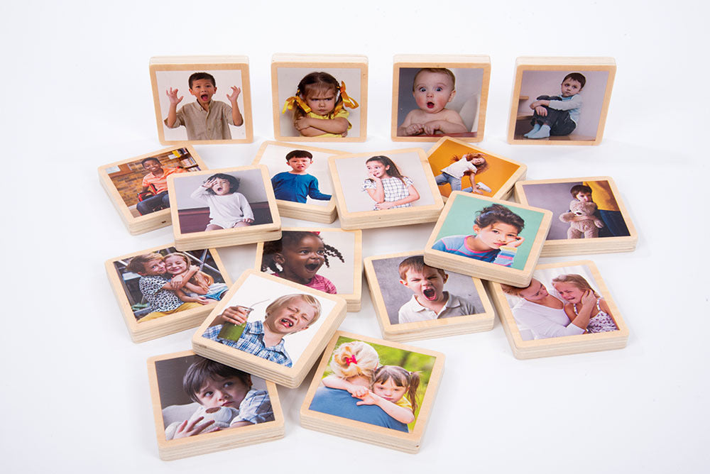18 smooth basswood ply square tiles, clearly colour printed on one side with real photographic images of children showing emotions and feelings. Ideal for talking to children about how they are feeling, teaching them to recognise the feelings of others, and helping them to develop the language to explain their emotions.
