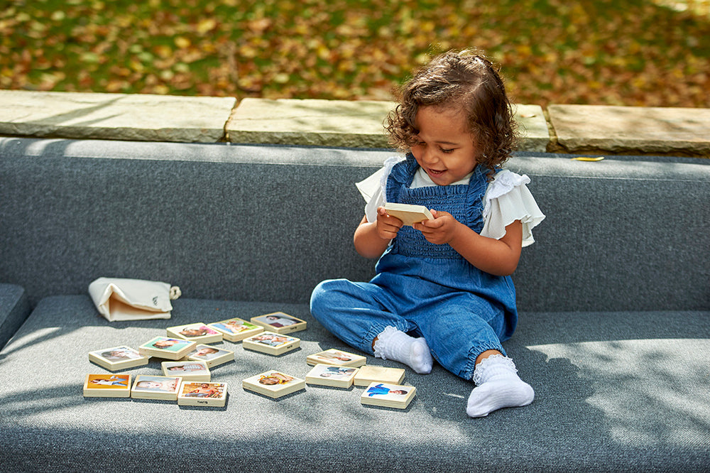 The tiles show different children displaying a range of 18 expressions and reactions, ranging from happy and excited to scared and angry. The emotions shown could be identified as a specific feeling, or as a starting point for a conversation about the different possible emotions or feelings being experienced. E.g. the child holding a teddy being comforted looks sad, which could be because he's feeling lonely or shy.