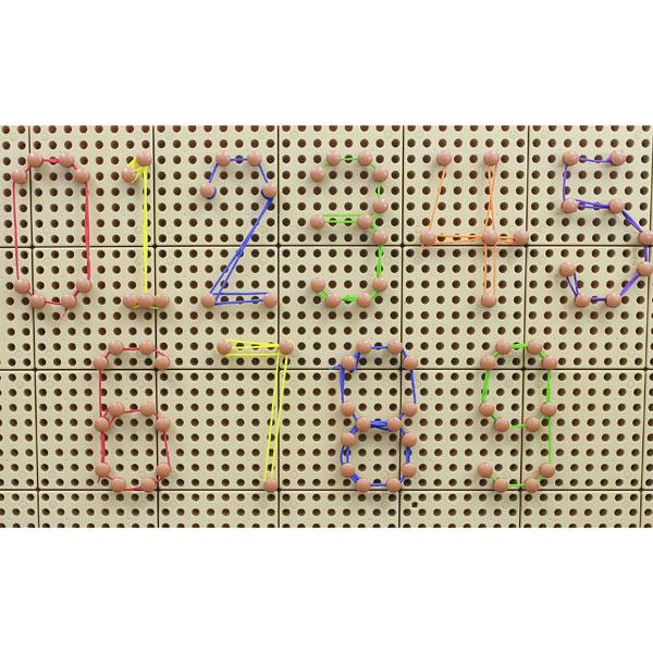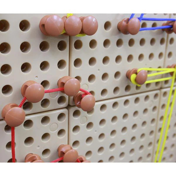 Children can create geometric shapes, alphabet and numbers by arranging the pegs then lacing with the colourful strings.