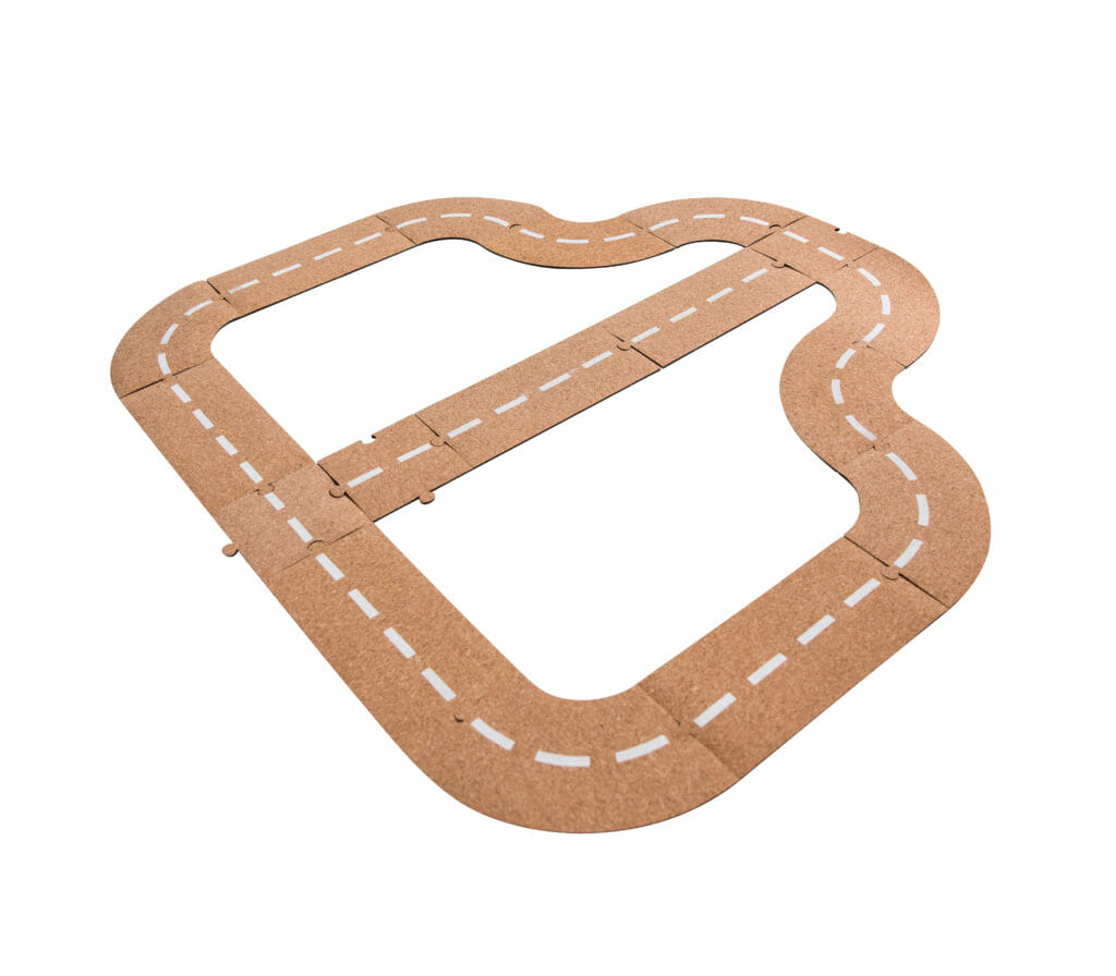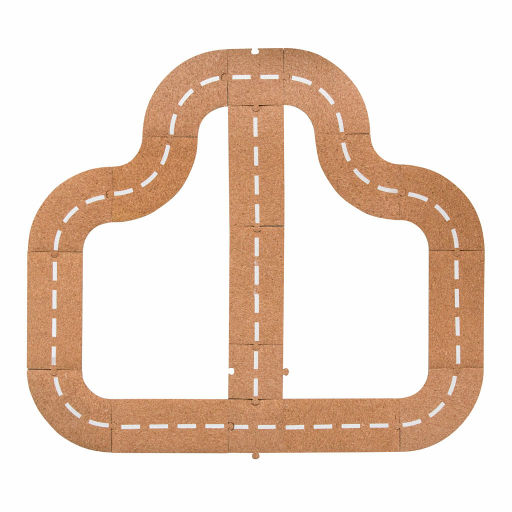 This 17 piece cork road mat set is like a giant puzzle, children will use problem solving skills to make the pieces fit together and connect as a circuit for their vehicles to drive on.