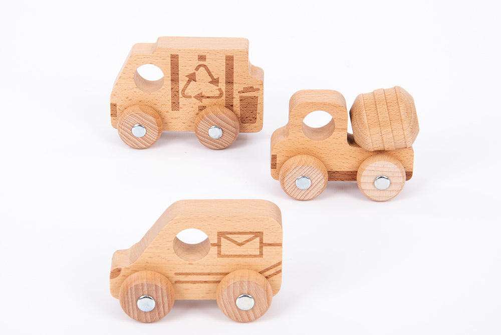 Beautiful natural solid beechwood vehicles, each with four rotating wheels, metal axles and lasered markings.