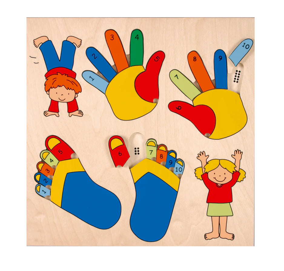 Inlay puzzle board with 10 colourful fingers and toes helps introduce number correspondence.