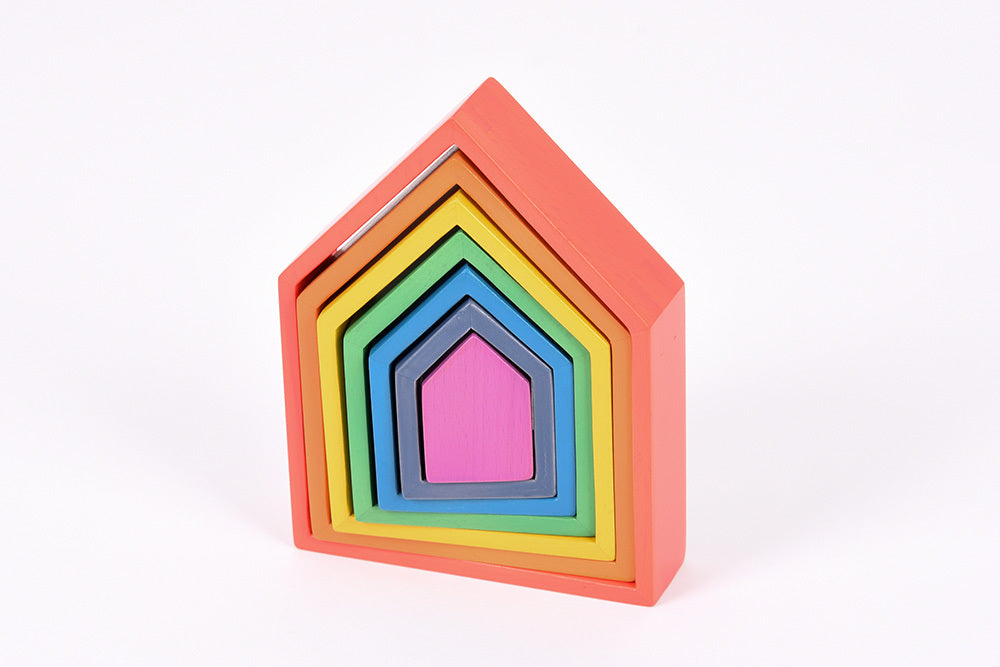 Beautiful solid beechwood nesting house shapes in the seven colours of the rainbow, with a natural finish to show the grain of the wood. An ideal extension to our award-winning Wooden Architect range.