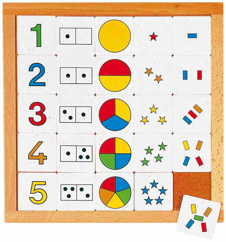 Tiles to depict one number value across rows and successive numerals down columns. Children learn to count items, match quantities and combine quantities with number symbols.