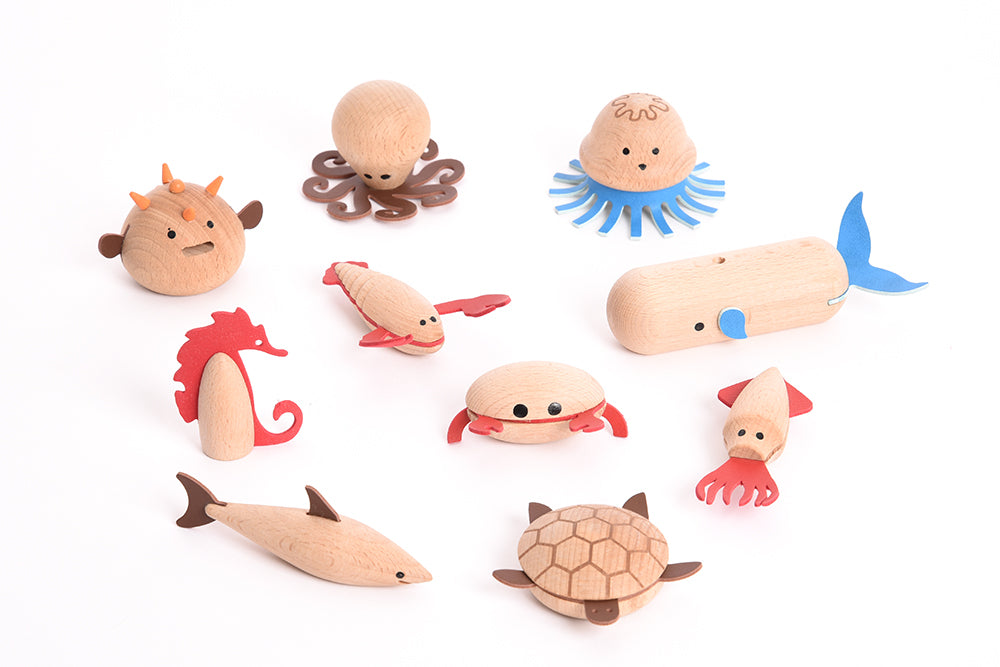 Fun, detailed solid beechwood sea creatures. With faux leather detailing in a range of bright colours, the set is ideal for inspiring storytelling, talking about the ocean and our global environment, using descriptive language, encouraging imaginative play and developing fine motor skills.