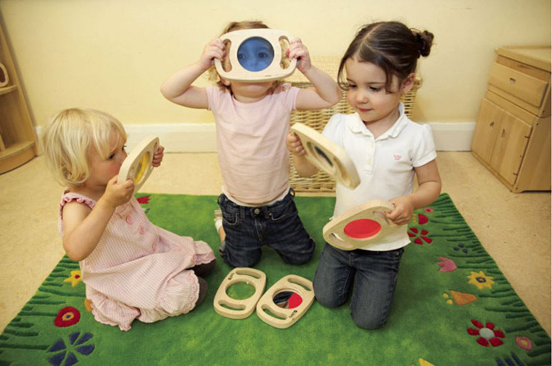 A 6 piece set allowing children to see the world through new eyes. The solid rubberwood frames enclose lenses to change the colour of everything they see, a giant magnifier and mirrors to give true and distorted reflections of the world around them. Can be stacked for colour mixing and for use on a light box. Set includes 3 translucent acrylic colour panels in light red, blue & yellow, a magnifying lens (with 2x and 3x magnification), a two sided convex/concave mirror and a plane mirror.