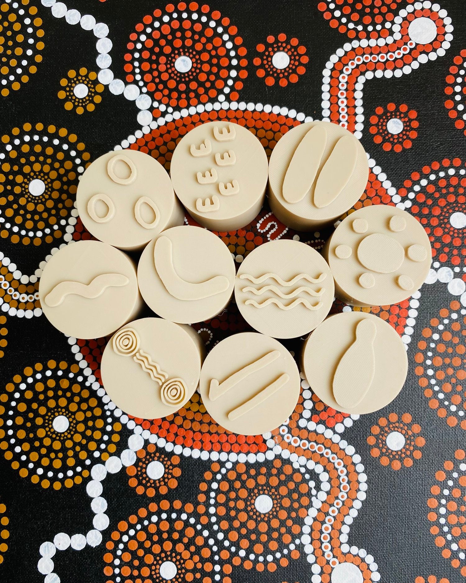 Featuring 10 Aboriginal symbols related to the themes of Country and Hunting.