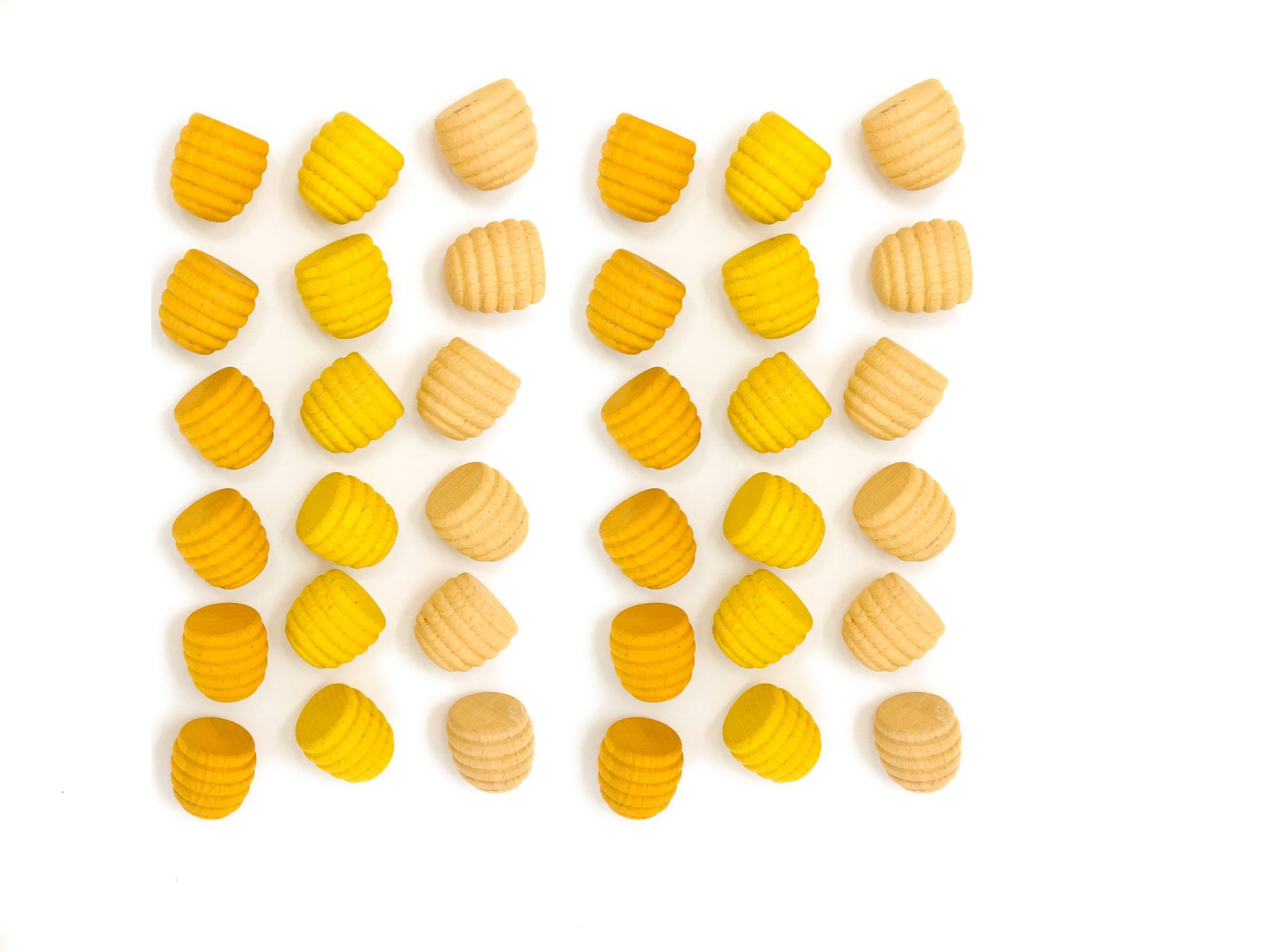 The Grapat Mandala Honeycomb set of 36 little yellow honeycombs. This is a superbly versatile, open ended, loose parts wooden toy and the possibilities of use are so exciting! Designed in order to create a unique sensory experience as you design your own mandala, this also encourages the development of fine motor skills and becomes a beautifully interactive way to teach children about symmetry.
