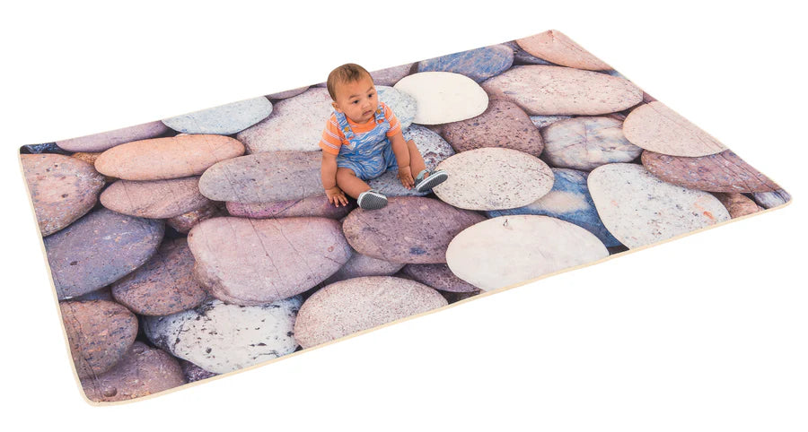 This soft memory foam mat features a pebbles design, offering comfort and sensory exploration.
