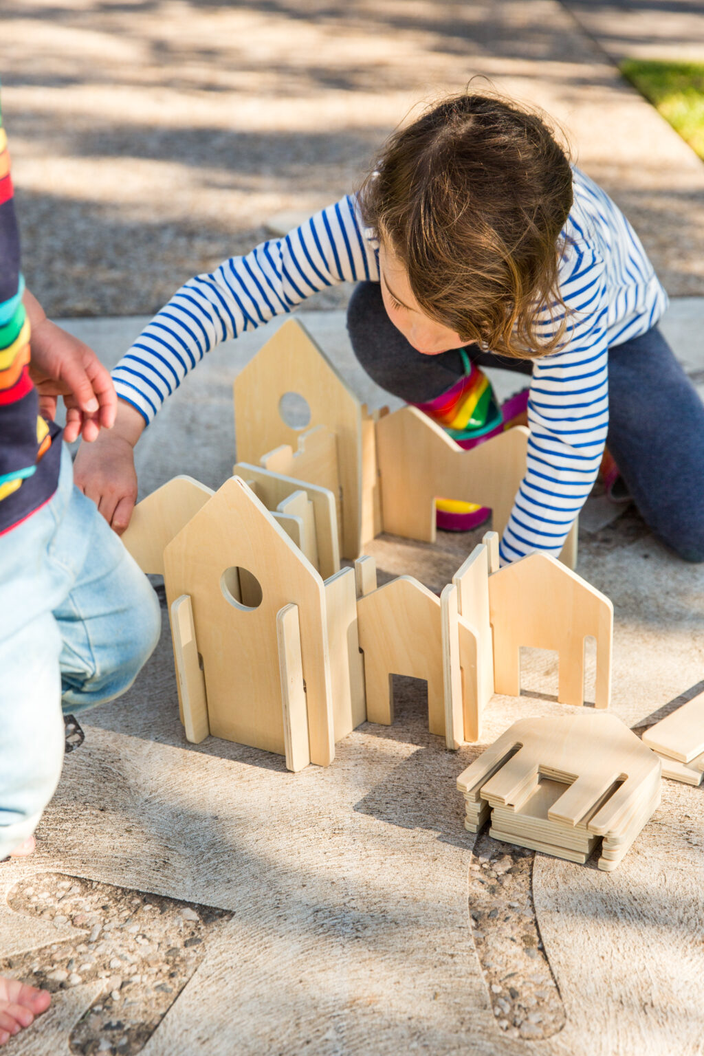It includes a variety of wooden sized pieces with different shaped windows and high doors. Designed to be packed away into a small box whilst also being able to reach up to a meter long in play.