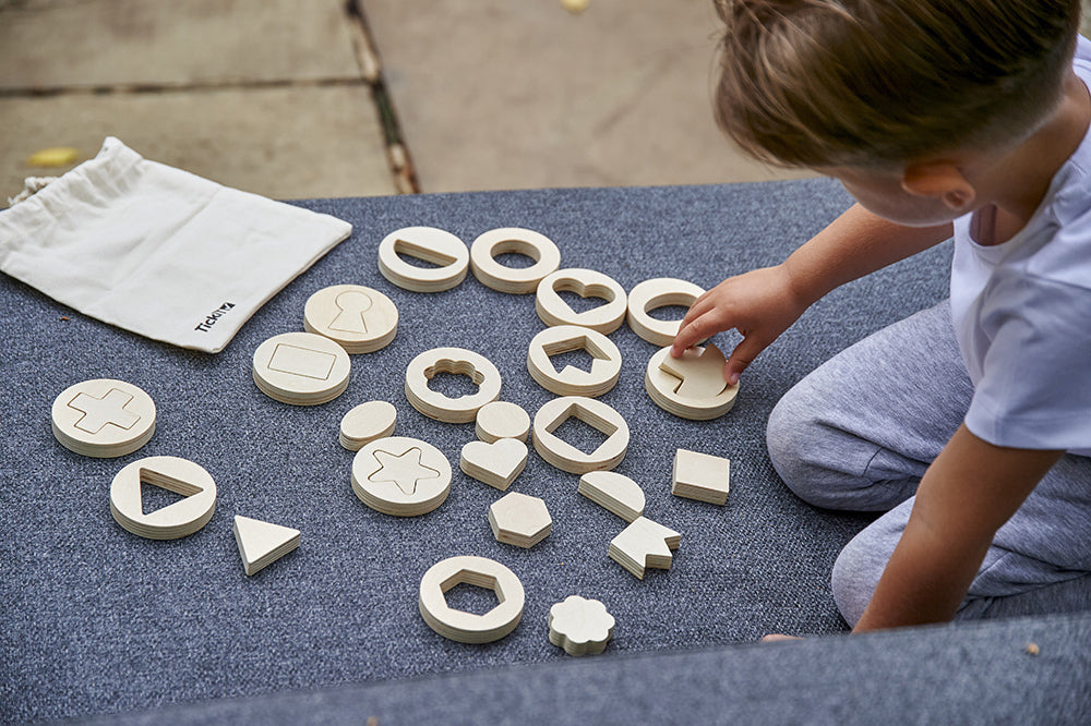 14 smooth and tactile birch plywood discs, each cut out with a different shape inside to make a captivating set of shape sorting puzzles.