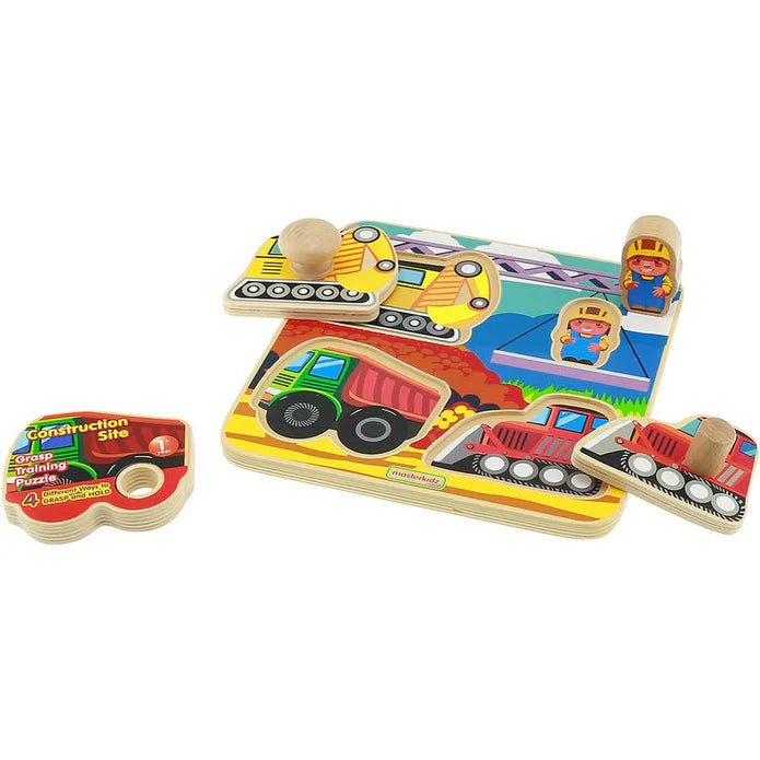Four types of fine motor skills are exercised. Pieces are gripped by either a jumbo knob, dowel, open circle or the solid piece.