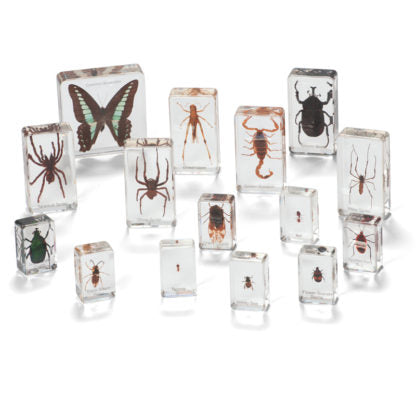 Unicorn Beetle, Flower Scarab Beetle, Green Rose Chafer Beetle, Spotted Red Bug, Wasp Spider, Ghost Spider, Tarantula, Butterfly, Grasshopper, Grass Cicada, Bee, Ant, Wasp, Termite, and Scorpion. (Butterfly is 75 x 75mm)