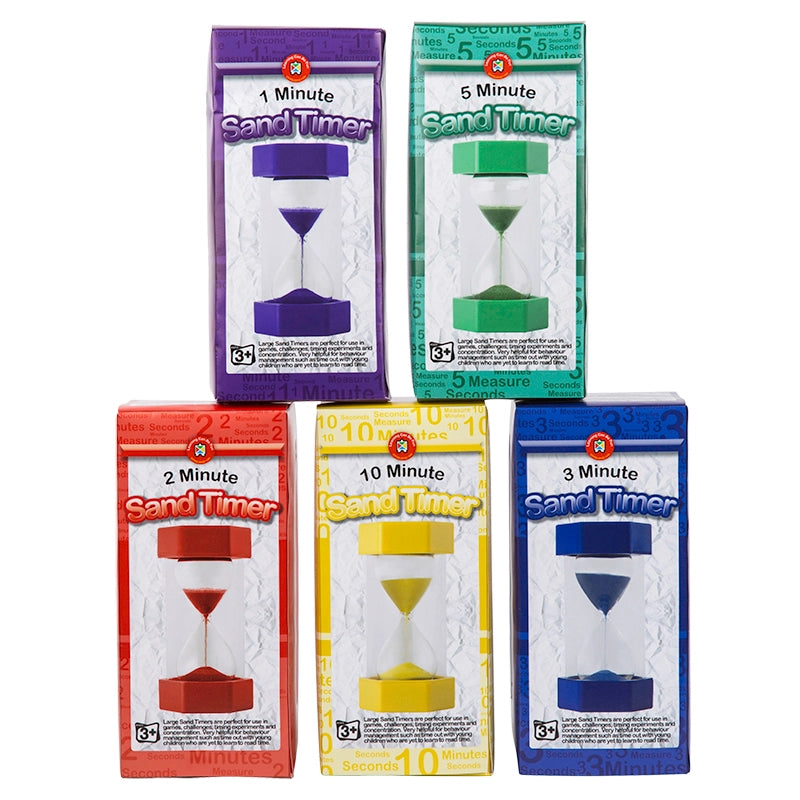 Virtually indestructible sand timers with moulded end caps and thick wall surrounds. For easy identification each timer is colour coded. Perfect for use in games, accurate event timing and experiments. Timers include 1, 2, 3, 5 and 10 minutes.
