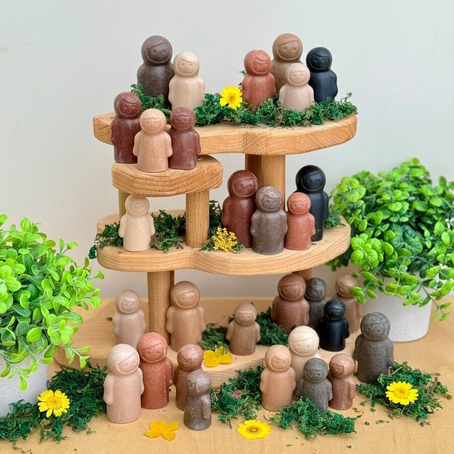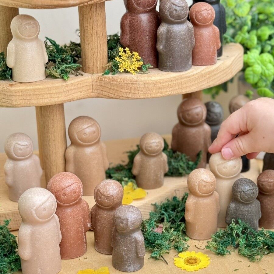 Featuring 30 figures in three different sizes and 10 different skin tones, their minimal features invite children to assign any emotion to the characters, fostering open-ended storytelling and social exploration.