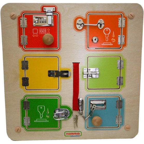 Great for developing better manual dexterity and fine motor skills whilst discovering about real world locks and catches.