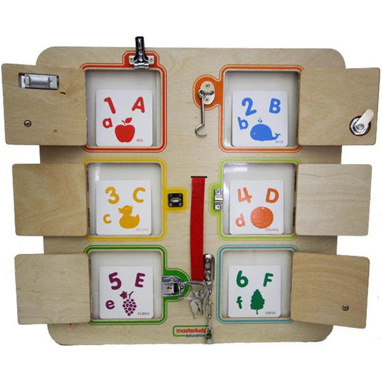 This ingenious learning board incorporates 6 closed and locked doors each with a space below to hide or place a picture card or photo.