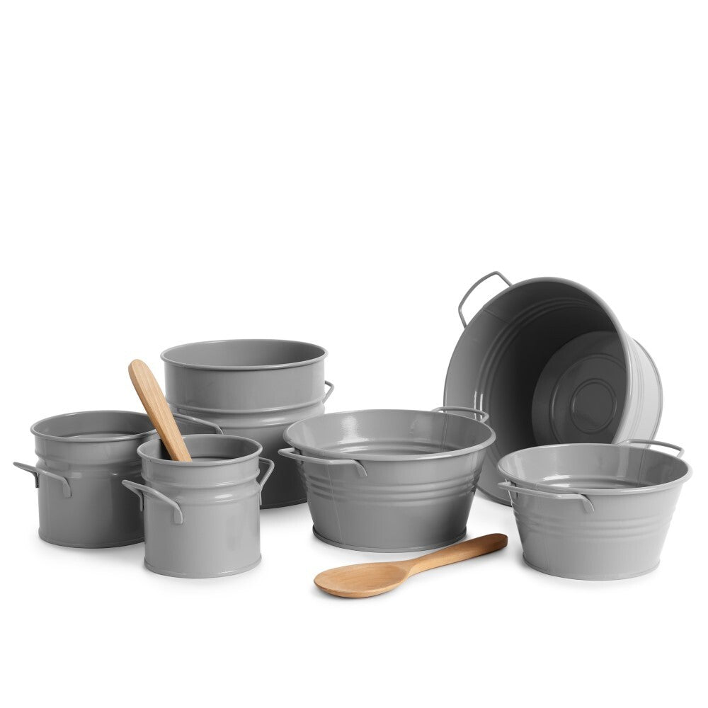 This set of sturdy metal cans and tubs will make a lovely addition to your outdoor area. There is something appealing about mixing, mashing, and squashing concoctions together in a metal can. Includes three cans and three tubs.