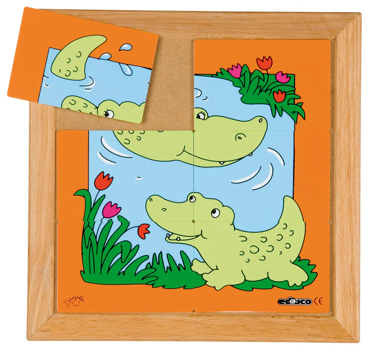 The puzzles vary from 6 to 12 plastic pieces each and have square or rectangular pieces.
