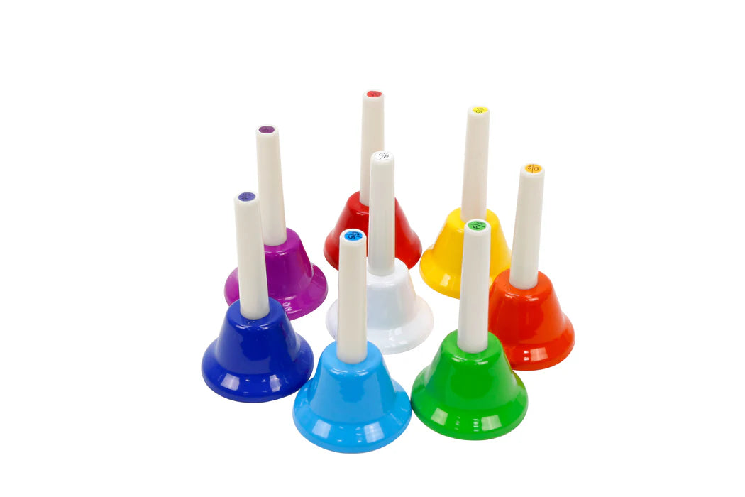 Each bell varies in colour and is identified by the note labelled on the handle.