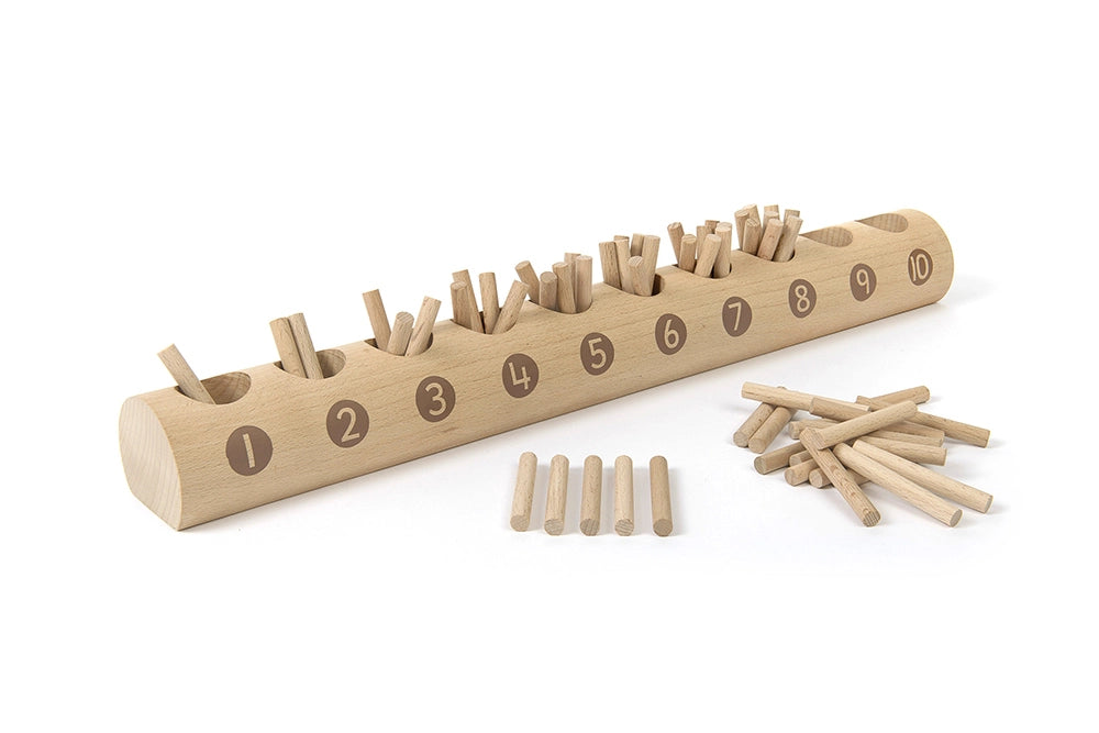 This simple wooden log has equal-sized holes into which children can count out the appropriate number of sticks from a pile.