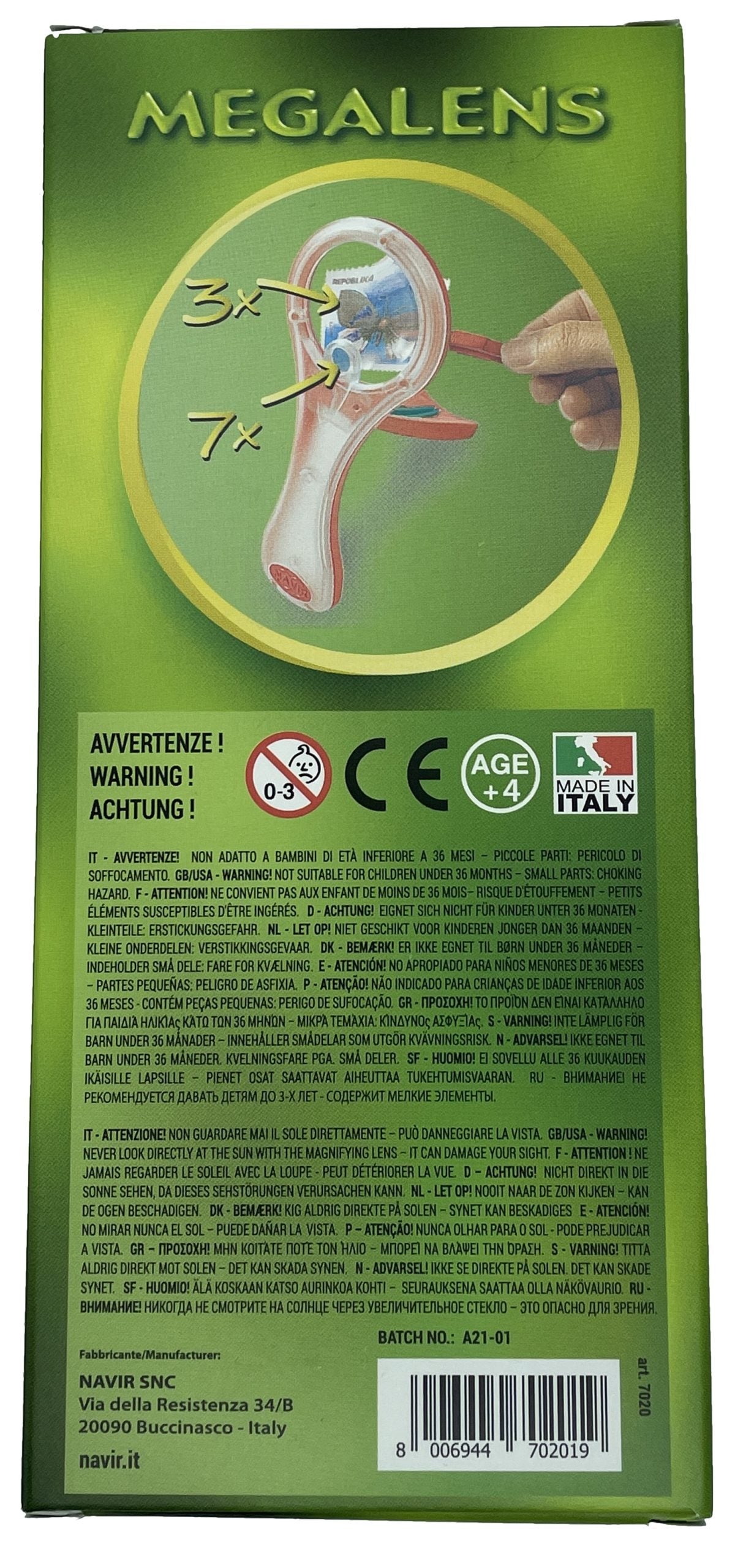 Megalens is a magnifying lens containing a second high-powered magnifier, the handle opens to make a stand, permitting its use on a work top with hands free. Extractable tweezers are inserted in the sleeve, making it possible to easily handle objects of small dimension.
