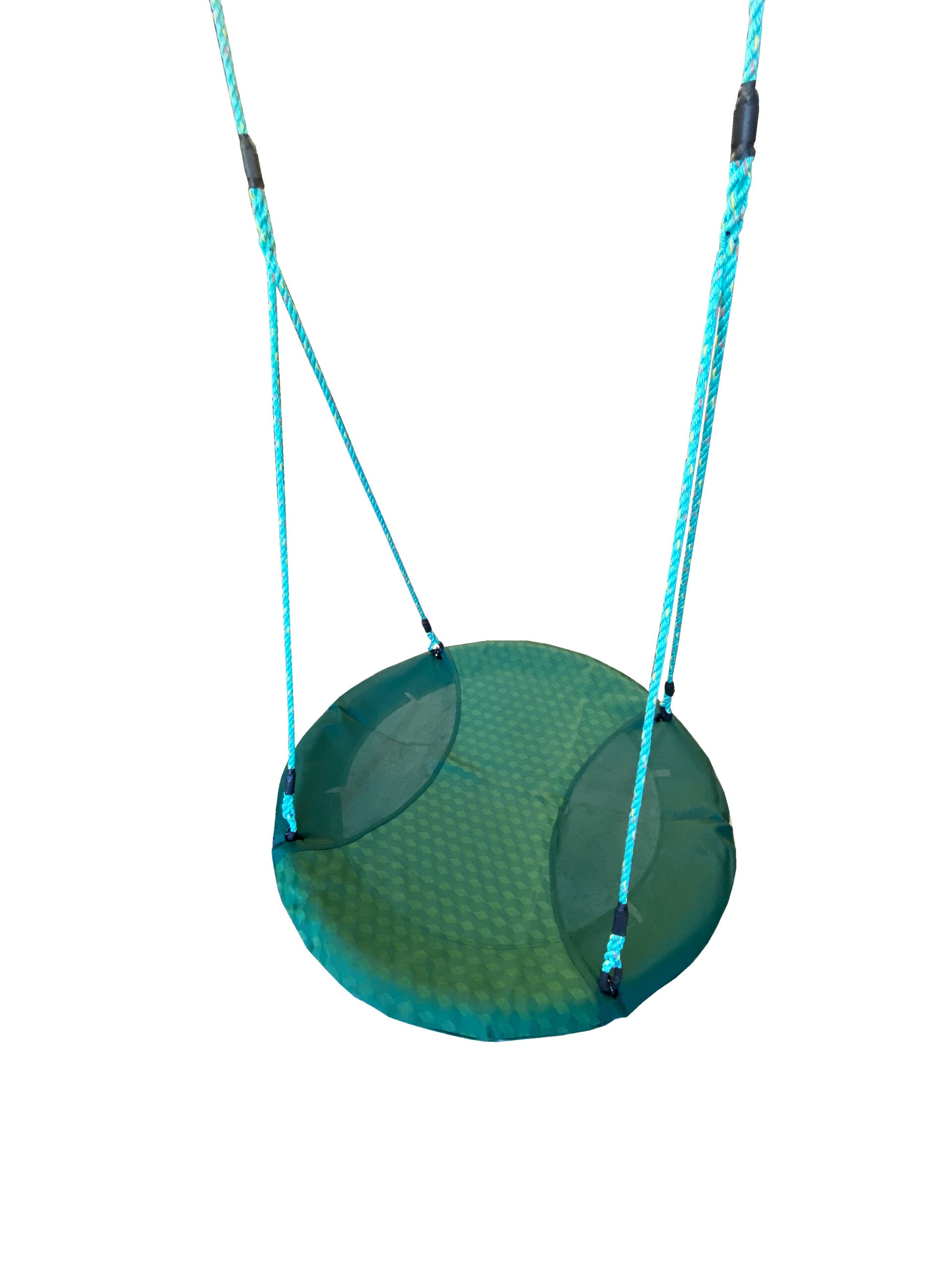 - Green ropes spliced onto ring with thimbles ready to hang.