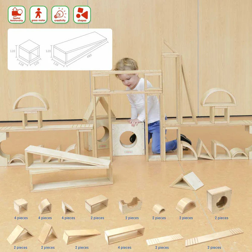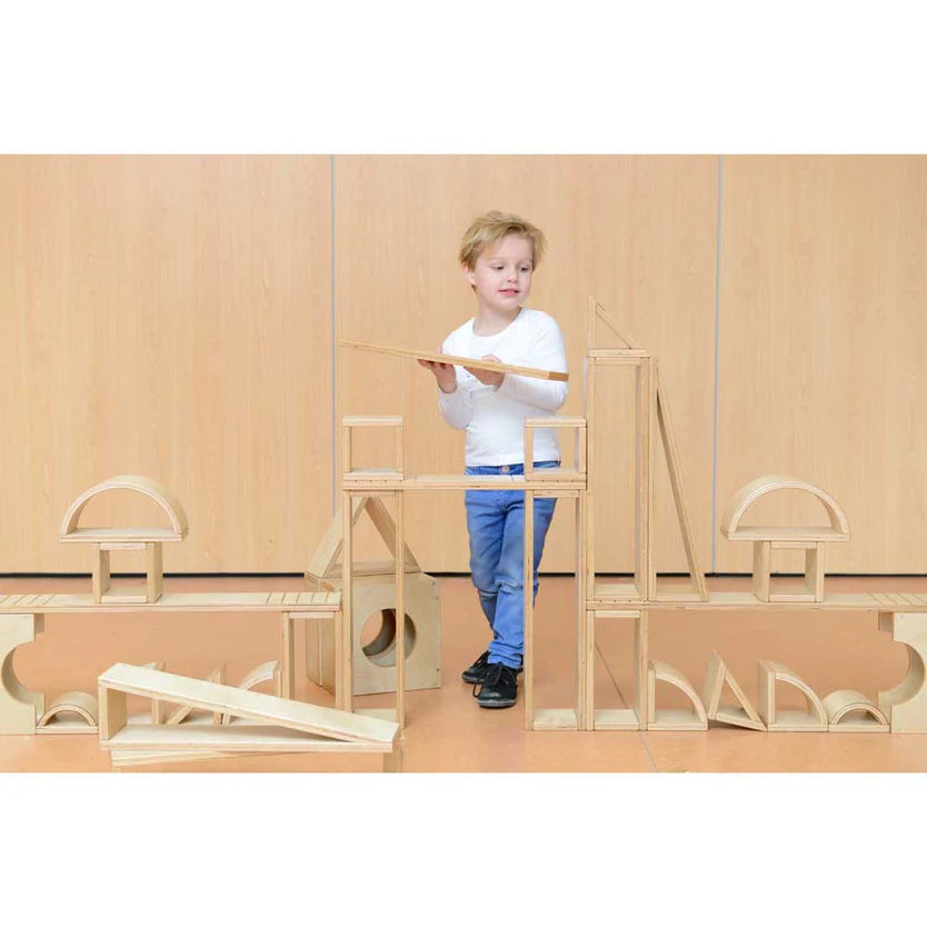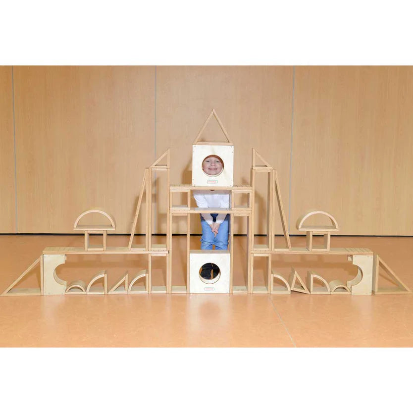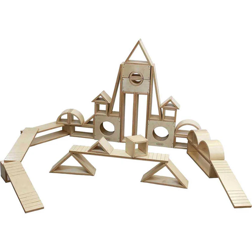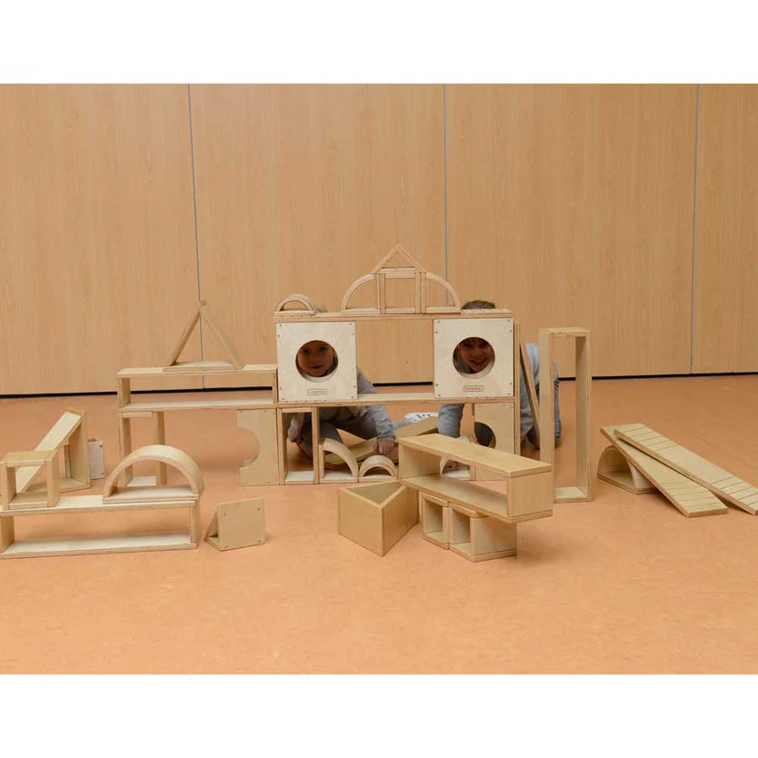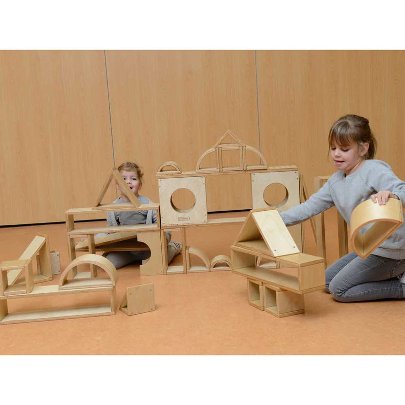A 35 piece set of giant wooden hollow blocks made of durable plywood.
