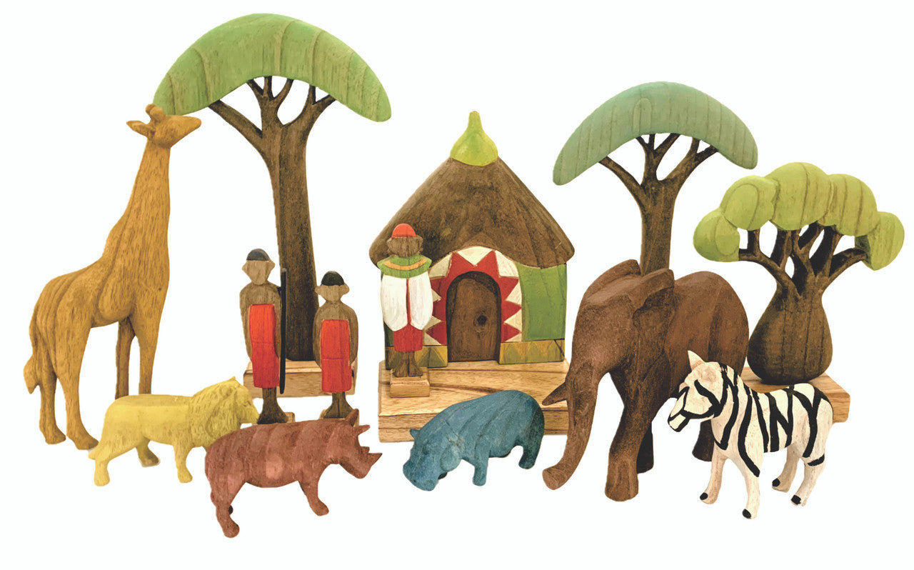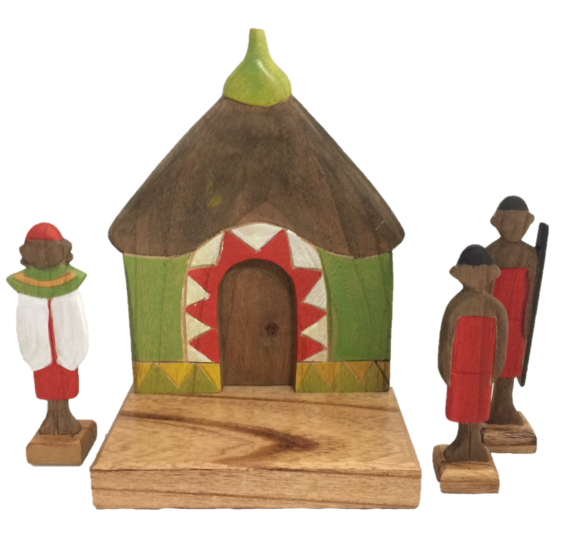 A beautiful addition to any African small world play set; this African hut with 3 Maasai warriors is hand carved and painted with top quality German dyes.