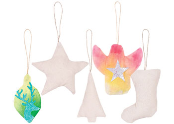 - Five assorted shapes include: angel, star, stocking, tree, and bauble.