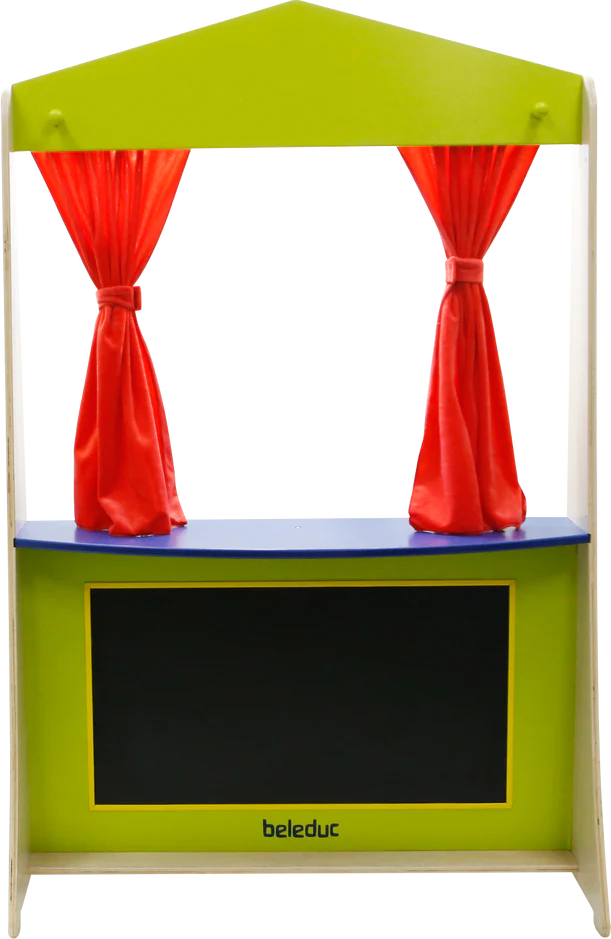The theatre has red curtains and a blackboard where the children can draw and write descriptions of their play and/or invite an audience to watch their performance.