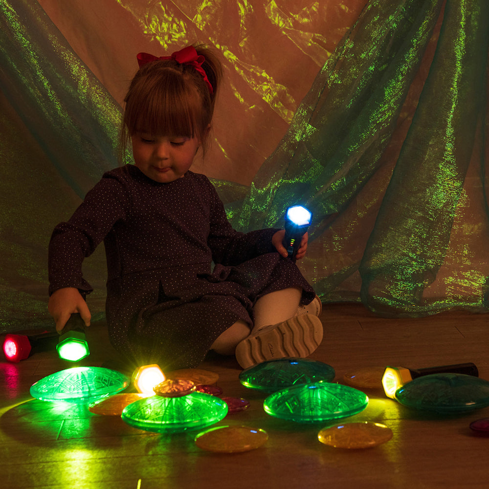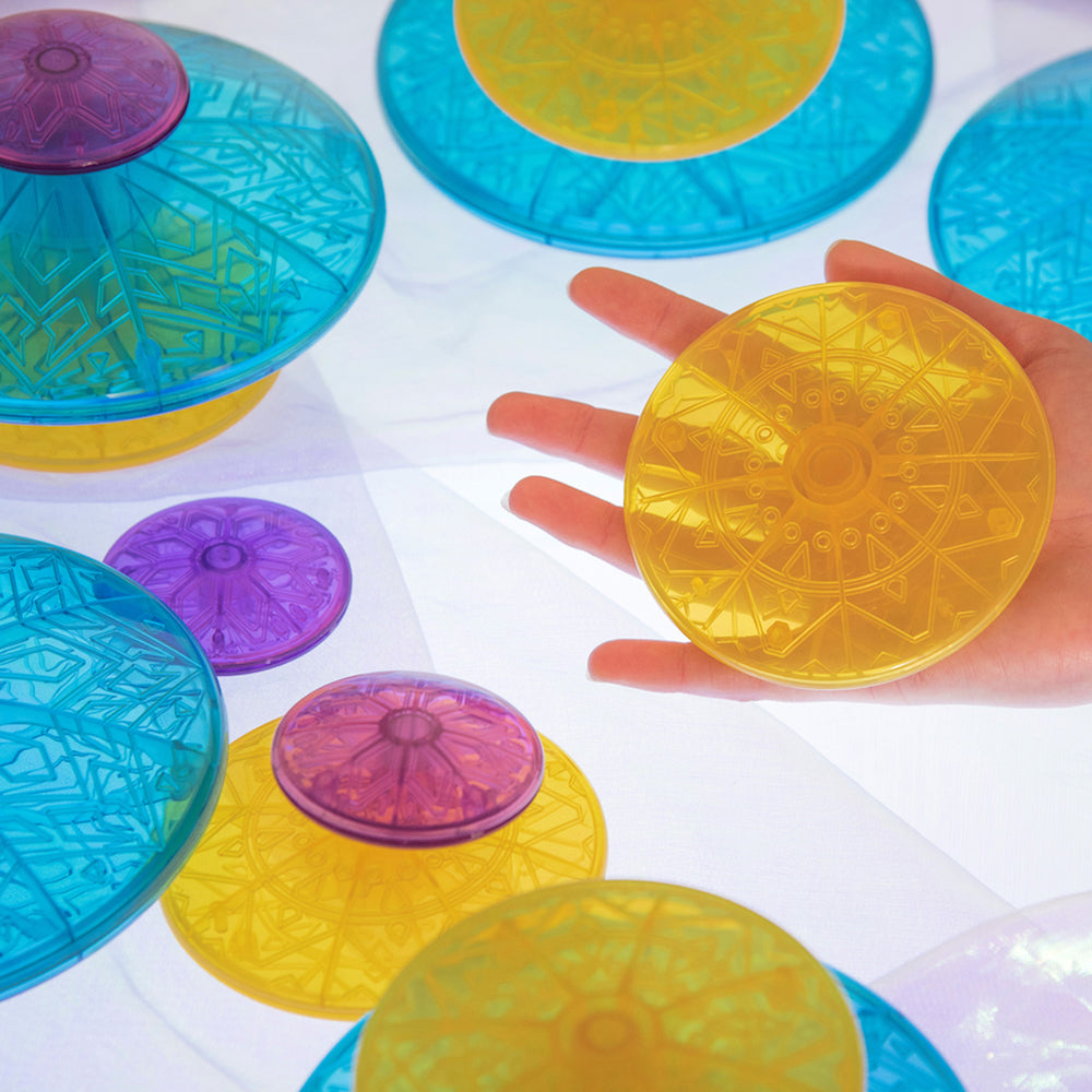 Children may stack, roll, sort, sequence, position and carefully balance them. Building a tower can be a really absorbing as well as calming, reflective activity. When used with a light panel the stained glass effect emerges and adds a new element.