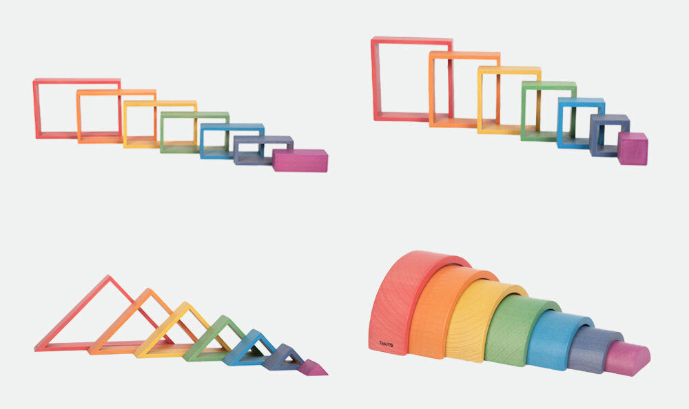 Beautiful smooth solid Beechwood nesting shape sets in the seven colours of the rainbow, with a natural finish to show the grain of the wood.