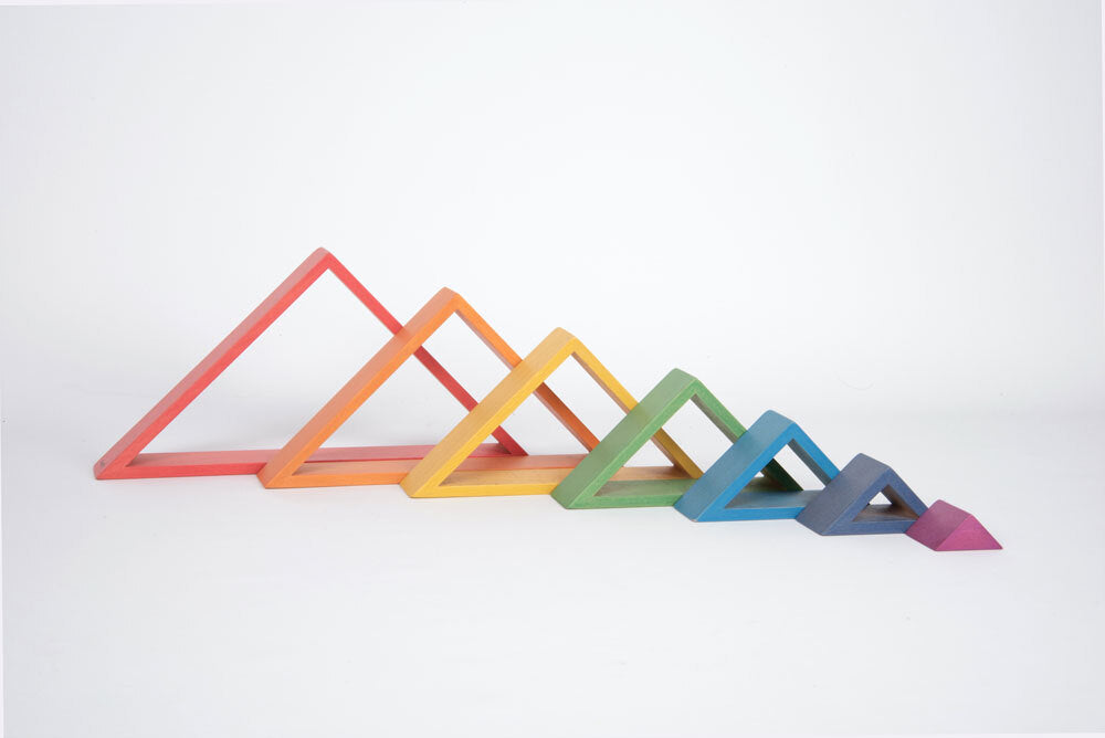 Beautiful smooth solid Beechwood nesting shape set in the seven colours of the rainbow, with a natural finish to show the grain of the wood.