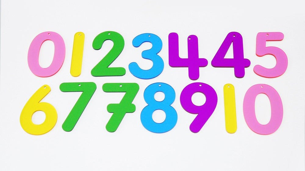 Set of 14 numbers from 0 to 9 made from colourful clear 3mm acrylic.