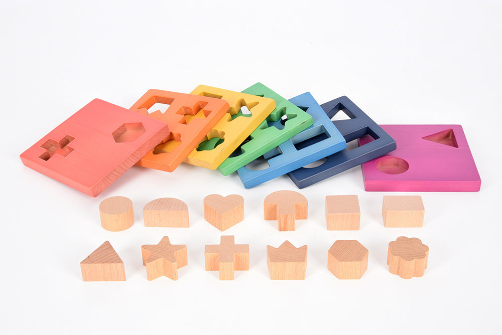 The smooth natural solid wooden shapes must be fitted correctly into their matching holes in each rainbow colour panel, then the panels can be layered to complete the stack.