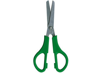 These left-handed, student stainless-steel scissors have green handles.