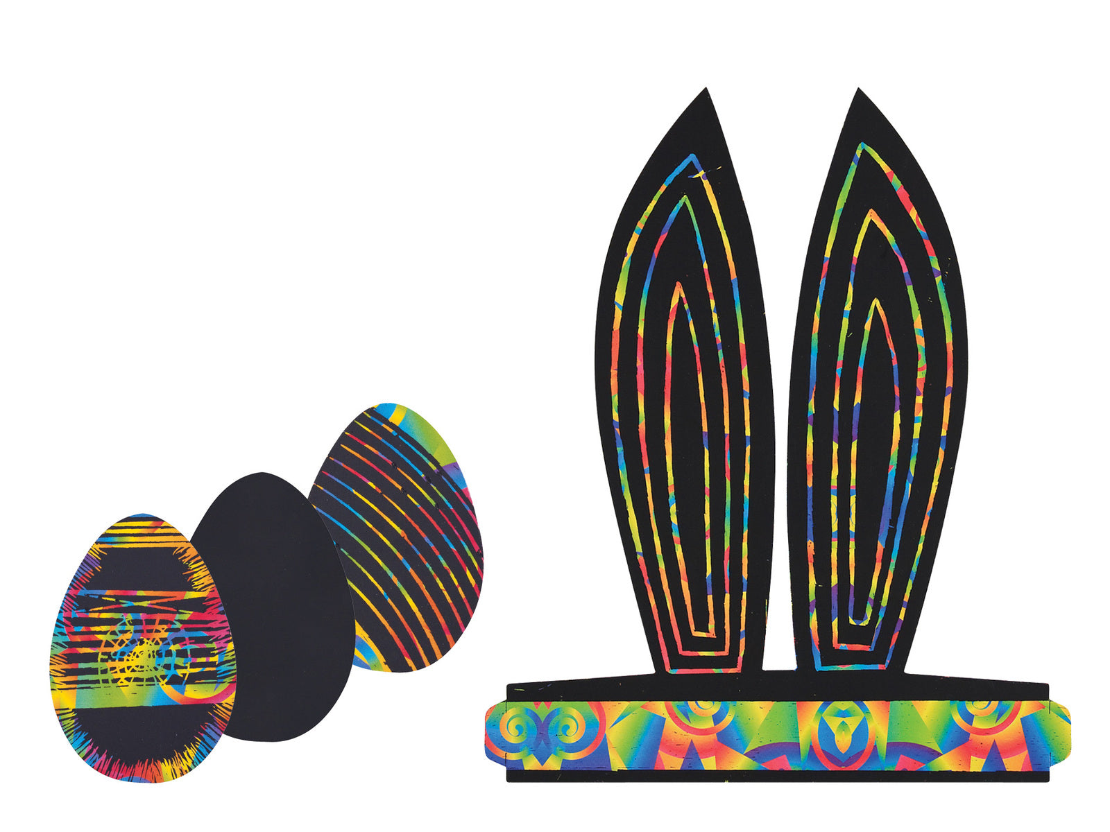 To decorate these Scratch Bunny Ears and Eggs simply scratch into the black coating using the included wooden tools to reveal the hidden rainbow colours underneath.