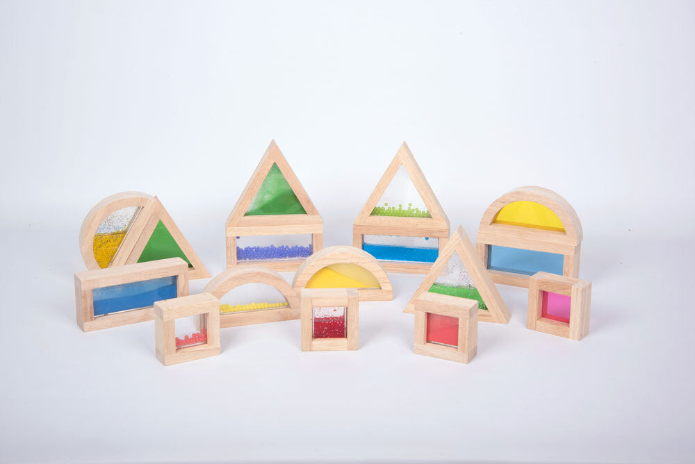 Large Rubberwood shapes with brightly coloured sensory centres containing beads, transparent acrylic, coloured sand, and water/glitter filled pockets.