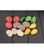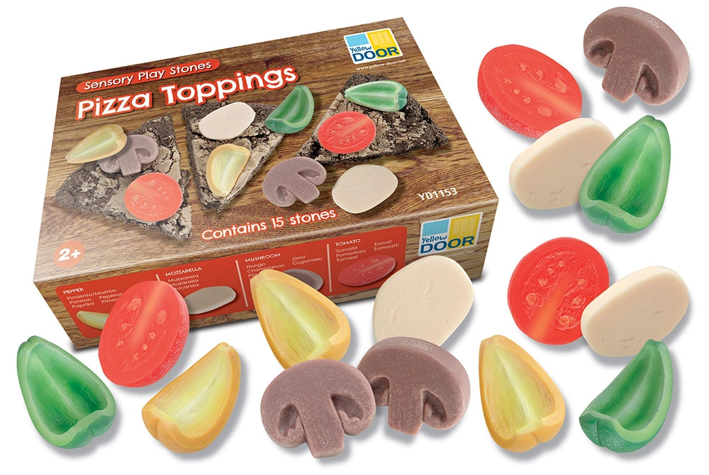 The set consists of 15 stones, three of each of the following: green pepper, mozzarella, mushroom, tomato and yellow pepper.