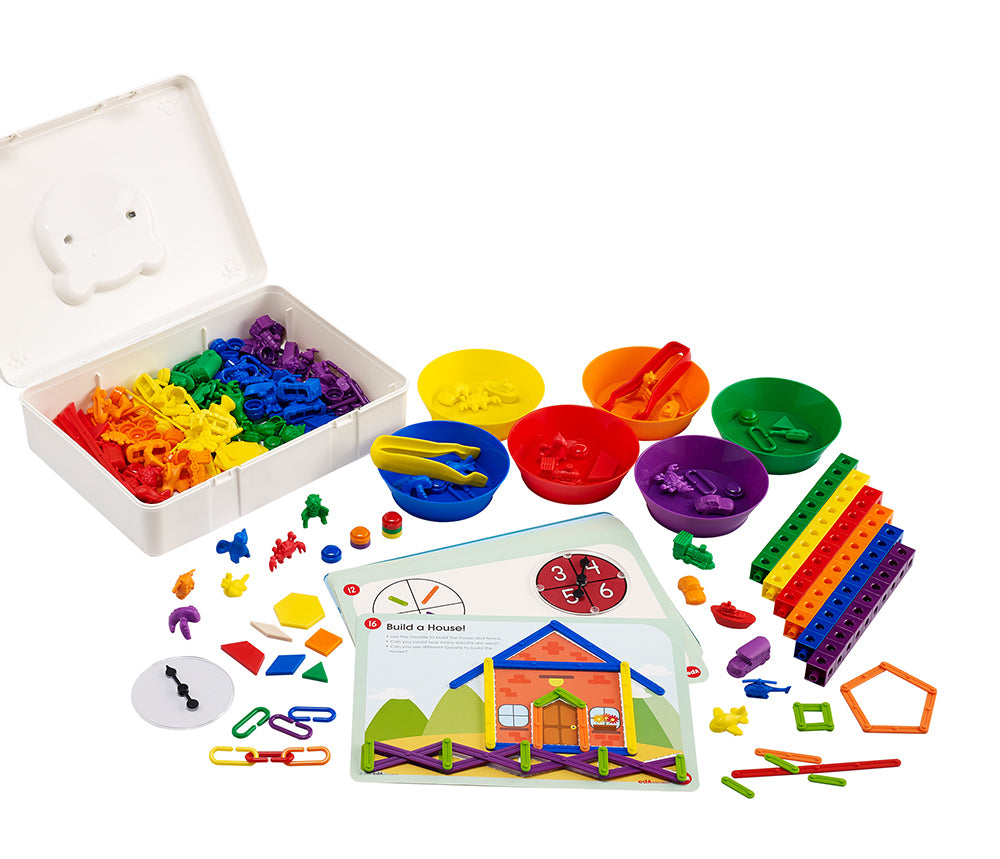 Set includes: 60x links, 6x sorting bowls, 2x transparent spinners, 36x transport counters, 36x monster counters, 72x stacking counters, 50x GeoStix, 60x linking cubes, 60x pattern blocks, 2x tweezers, 12x 2-sided activity crds and an activity guide.