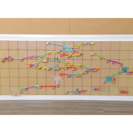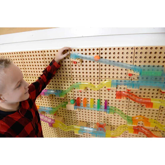 Children can build ball tracks on the STEM Wall extending to a table or the floor.