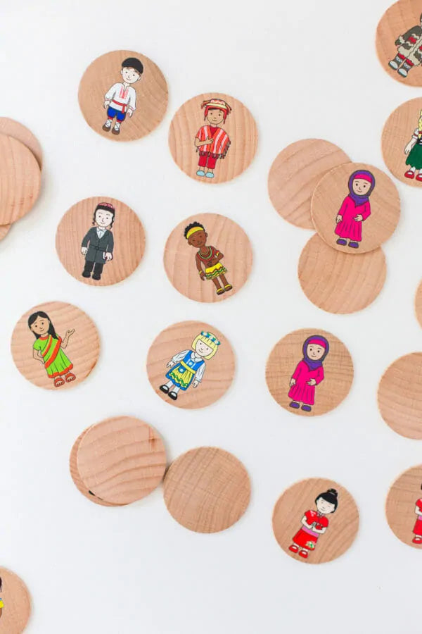 Made up of 16 pairs of diverse cultures including African, Scottish, South Korean and European to name only a few, these high-quality wooden discs are perfect for memory development as well as encouraging conversations about multiculturalism, community, diversity and inclusiveness whilst learning about different cultures from all around the World.
